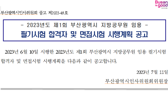 확인하시고 미리 면접 준비해 보세요. (공고문) 2023년도 제1회 부산광역시 지방공무원 임용 필기시험 합격자 및 면접시험 시행계획(게시).hwpx0.06MB