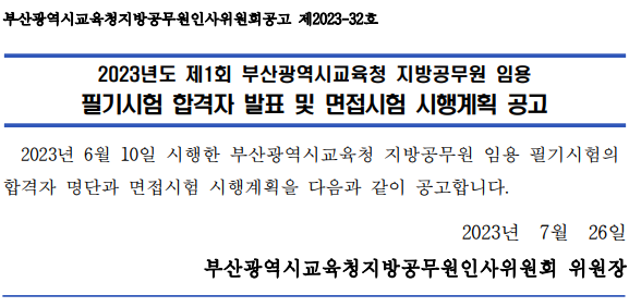 2023 지방직 9급 교육행정직 부산 필기시험 합격자 확인