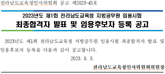 2023년도 전남 지방공무원 임용시험 결과 최종합격한 222명 예비공무원 여러분 진심으로 축하드립니다.