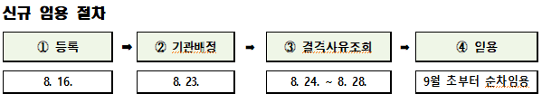 위와같이 신규 임용 절차가 진행되오니 참고하시기 바랍니다. 또한 근무기관 배정 기준의 경우 임용후보자 성적순에 따라 희망하는 근무기관에 배정을 한다고 하니 이 점도 참고하시기 바랍니다.