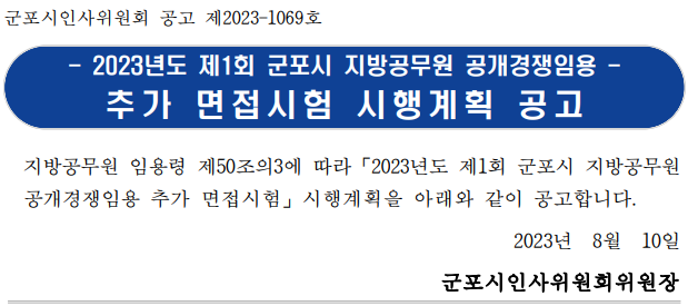 2023년도 군포 9급 지방직 공무원 임용시험 결과 추가면접 기회 얻으신 예비공무원 여러분 진심으로 축하드립니다.