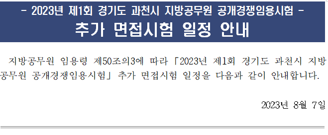 최종합격자 발표일은 2023. 8.21.(월) 채용공고 과천시 홈페이지 채용공고란에 게시됩니다.