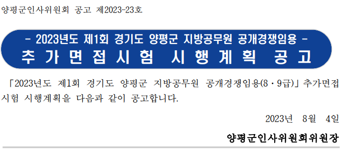 2023년도 양평 9급 지방직 공무원 임용시험 결과 추가면접 기회 얻으신 예비공무원 여러분 진심으로 축하드립니다.