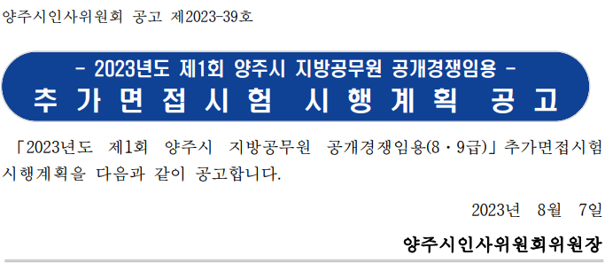 2023년도 양주 9급 지방직 공무원 임용시험 결과 추가면접 기회 얻으신 예비공무원 여러분 진심으로 축하드립니다.