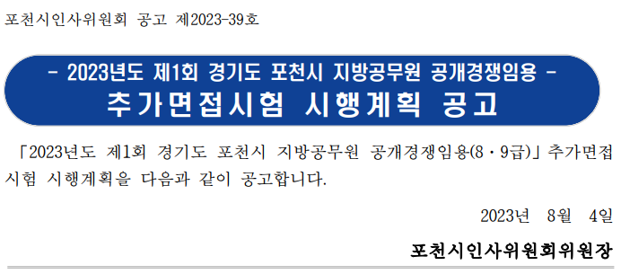 최종합격자 발표일은 2023. 8.21.(월) 채용공고 포천시 홈페이지 채용공고란에 게시됩니다.