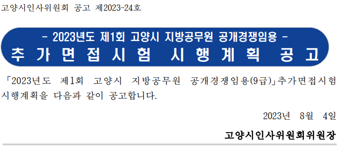 2023년도 고양 9급 지방직 공무원 임용시험 결과 추가면접 기회 얻으신 예비공무원 여러분 진심으로 축하드립니다.