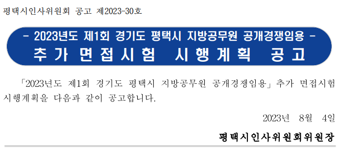 2023년도 평택 9급 지방직 공무원 임용시험 결과 추가면접 기회 얻으신 예비공무원 여러분 진심으로 축하드립니다.