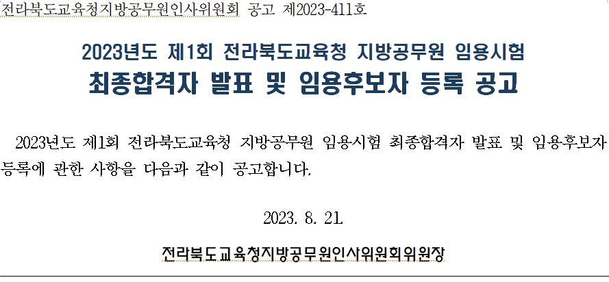 최종합격자 전원(190명)은 2023. 8. 29.(화) ~ 2023. 8. 30.(수) 09:00~17:00에 전라북도교육청 창조나래 3층 시청각실로 오셔서 신규임용후보자 등록을 하셔야 합니다. 등록을 하지 않으실 경우 지방공무원임용령 제11조 제3항의 규정에 의하여 공무원으로 임용될 의사가 없는 것으로 간주한다고 합니다.