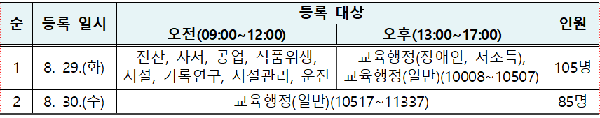위와 같이 직렬별로 등록하는 시간이 다르니 확인하시고 시간 맞춰 등록하러 가시기 바랍니다.