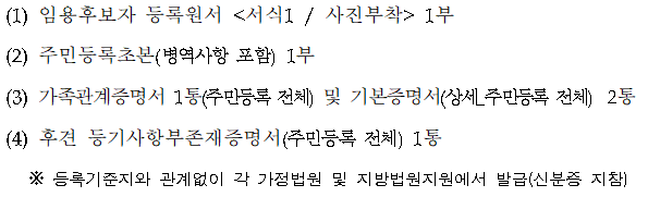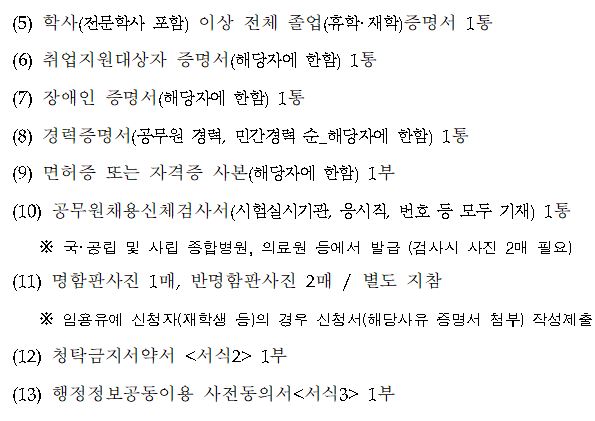 ※ 아래 서류 중 신체검사용 채용 신체검사서의 경우 당일 발급이 안되는 경우가 있으므로, 의료기관에 발급여부 확인 등을 미리 확인하신 후 방문하시기 바랍니다.