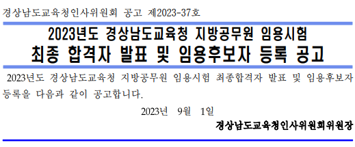 2023년도 경남교육청 지방공무원 임용시험 결과 최종합격한 238명 예비공무원 여러분 진심으로 축하드립니다.