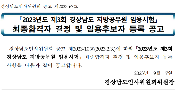 2023년도 경남 지방공무원 임용시험 결과 최종합격한 977명 예비공무원 여러분 진심으로 축하드립니다.