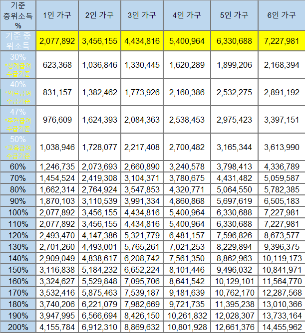 2023년 기준 중위소득은 아래 표와 같습니다.