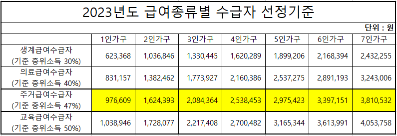 2023년도 각종 급여 대상과 기준주거급여 대상은 소득인정액 기준