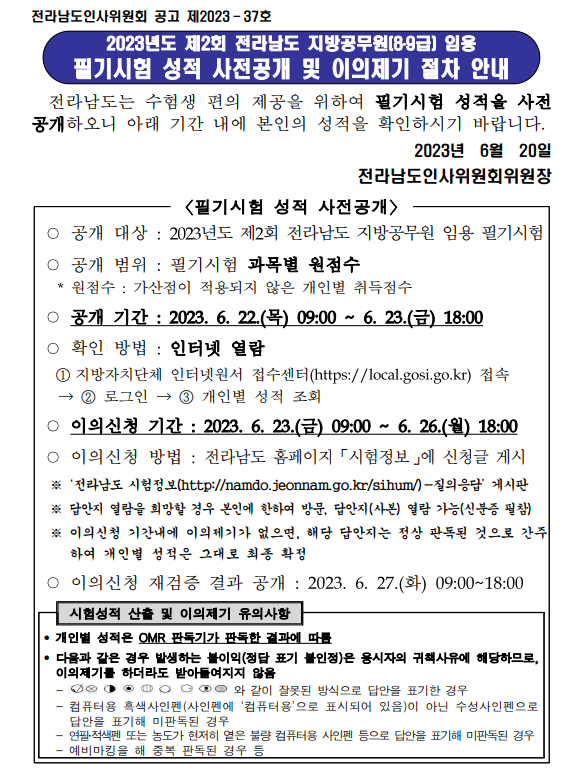 2023 지방직 필기시험 성적 사전공개 확인
