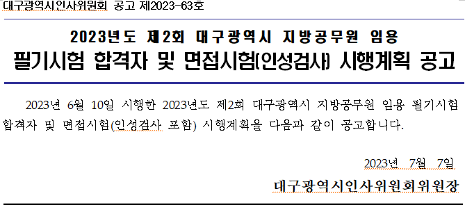 2023 지방직 9급 공무원 대구광역시 필기시험 합격자 확인