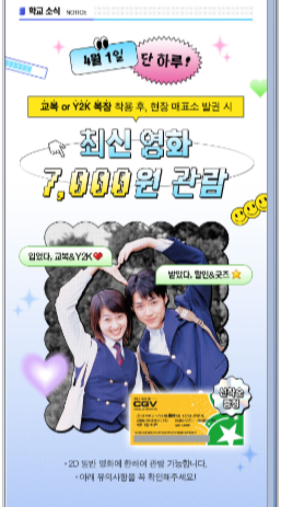 CGV 고객이라면 누구나 참여 가능하므로, 이번 주말에는 교복이나 Y2K(2000년대) 의상을 입고 CGV를 방문해보세요!
