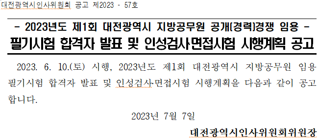확인하시고 미리 면접 준비해 보세요. ★공고문 2023년도 제1회 대전광역시 지방공무원공개경력경쟁 임용 필기시험 합격자 발표 및 인성검사,면접시험 시행계획 공고.hwpx0.08MB